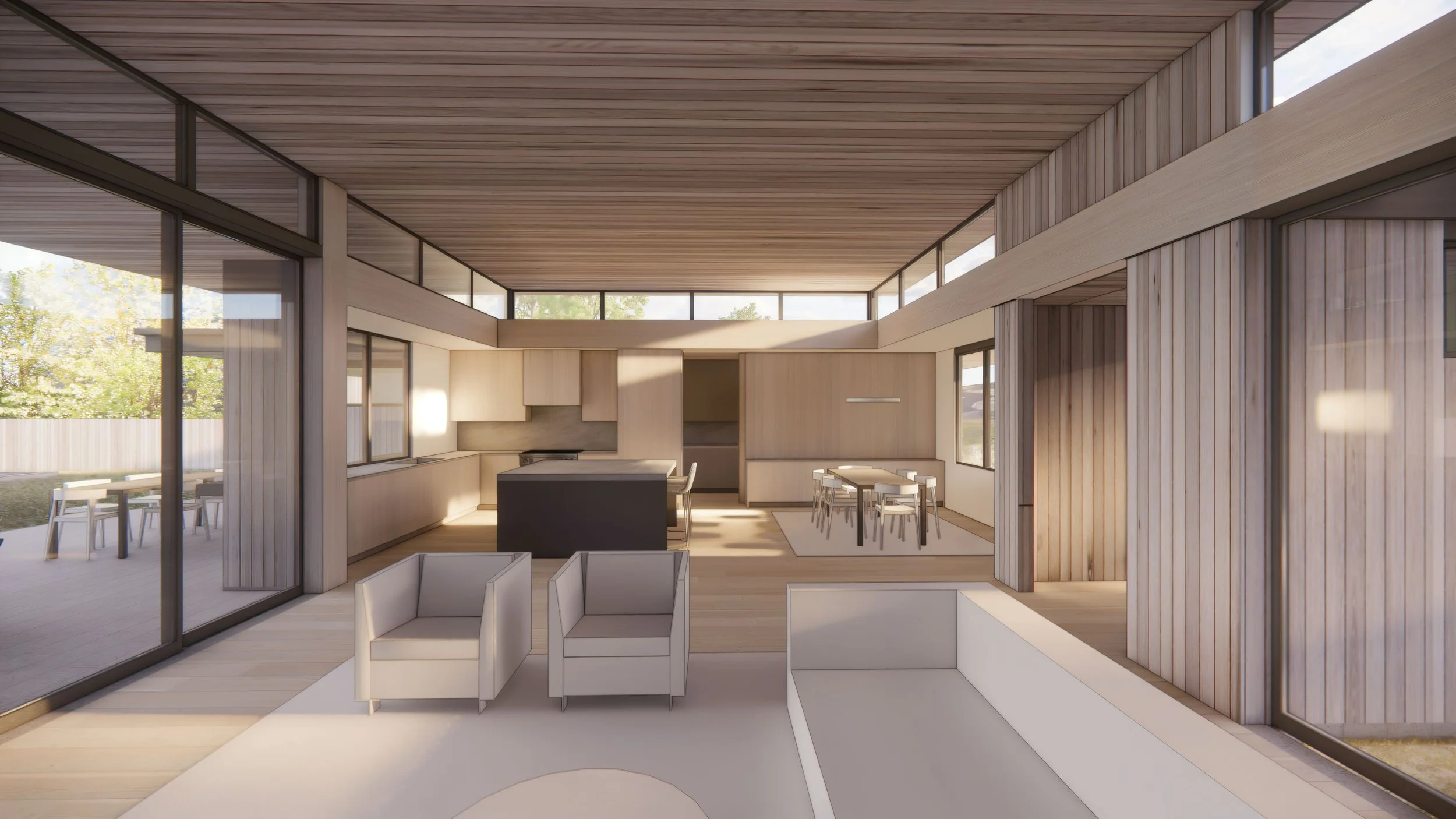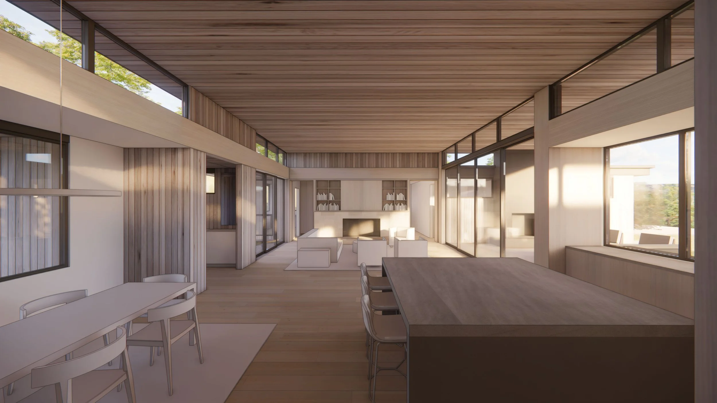 To enhance the cycle of natural daylight in the main living areas, the ceiling was lifted to incorporate a band of perimeter transom windows that span both solid wall sections and transparent zones of glass that slide open to outdoor extensions of the floor plan.