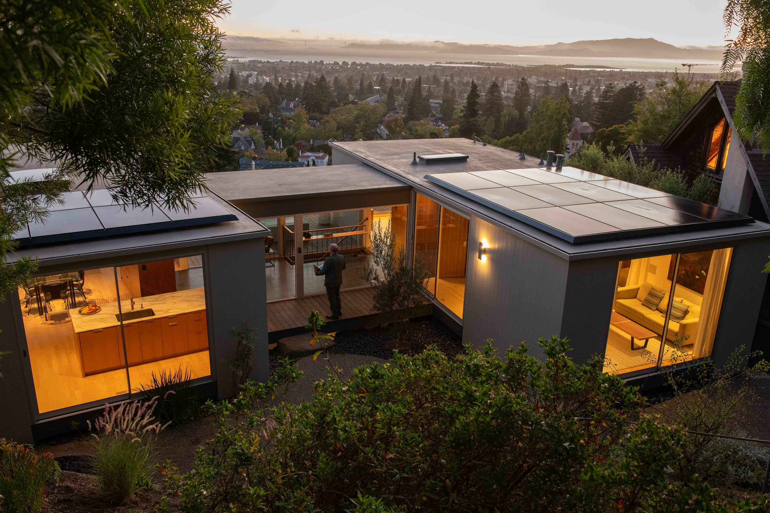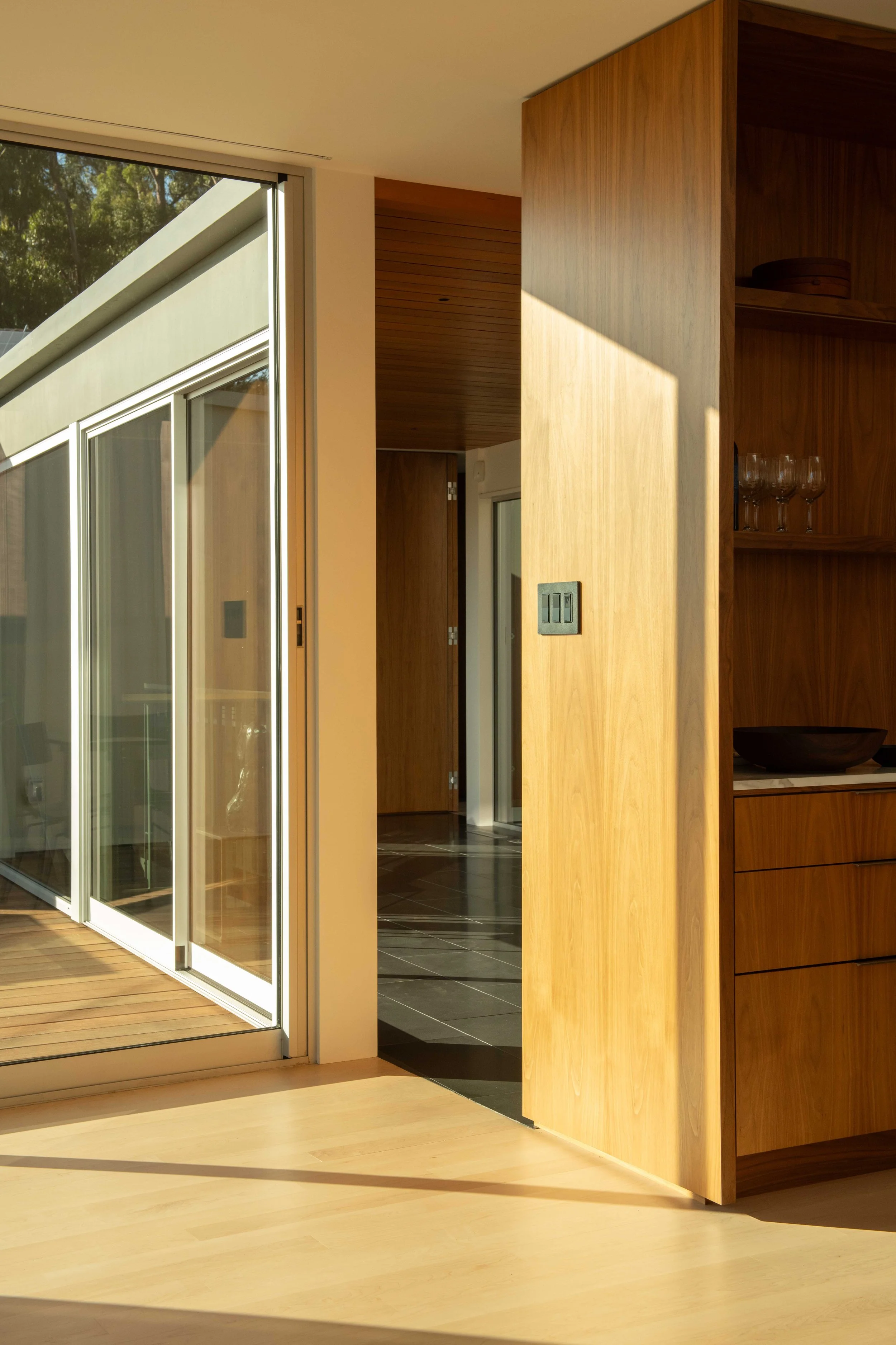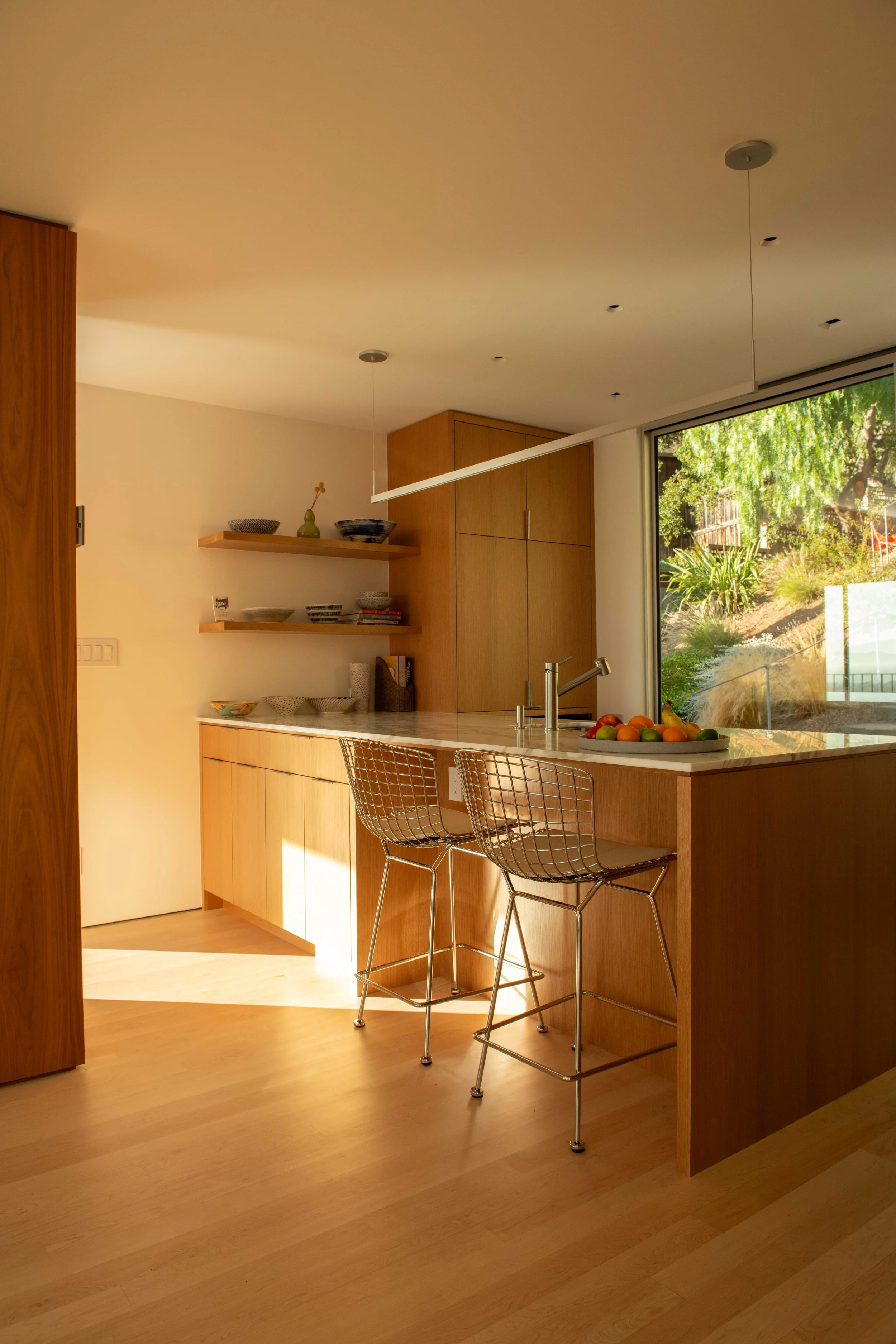 A returning client sought our help in the complete remodel of a 1957 ranch house in Oakland, CA. The kitchen was opened up to capture views of the San Francisco Bay. A fireplace dividing the dining and living rooms was re-clad in ledge stone, complementing a custom designed dining table, vintage Scandinavian chairs, and sculptural lighting. In collaboration with the client, an interplay between wood, stone, and muted color palettes was used to create a clean, contemporary space for dining and entertaining.